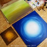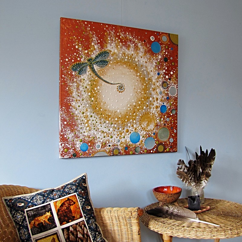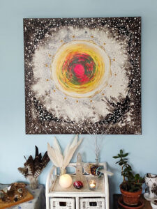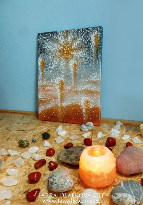 A teď když to píšu, uvědomuji si to propojení těchto barev a jejich účinků s dalším názvem Fénixovo srdce. Fénix je symbolem uzdravování, znovuzrození, moudrosti. Speciálně u tohoto obrazu bych tedy doporučila naladit se a pozvat do krajiny vnitřního světla průvodce Fénixe, se kterým můžete dále pracovat.