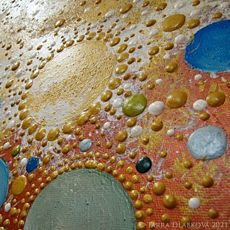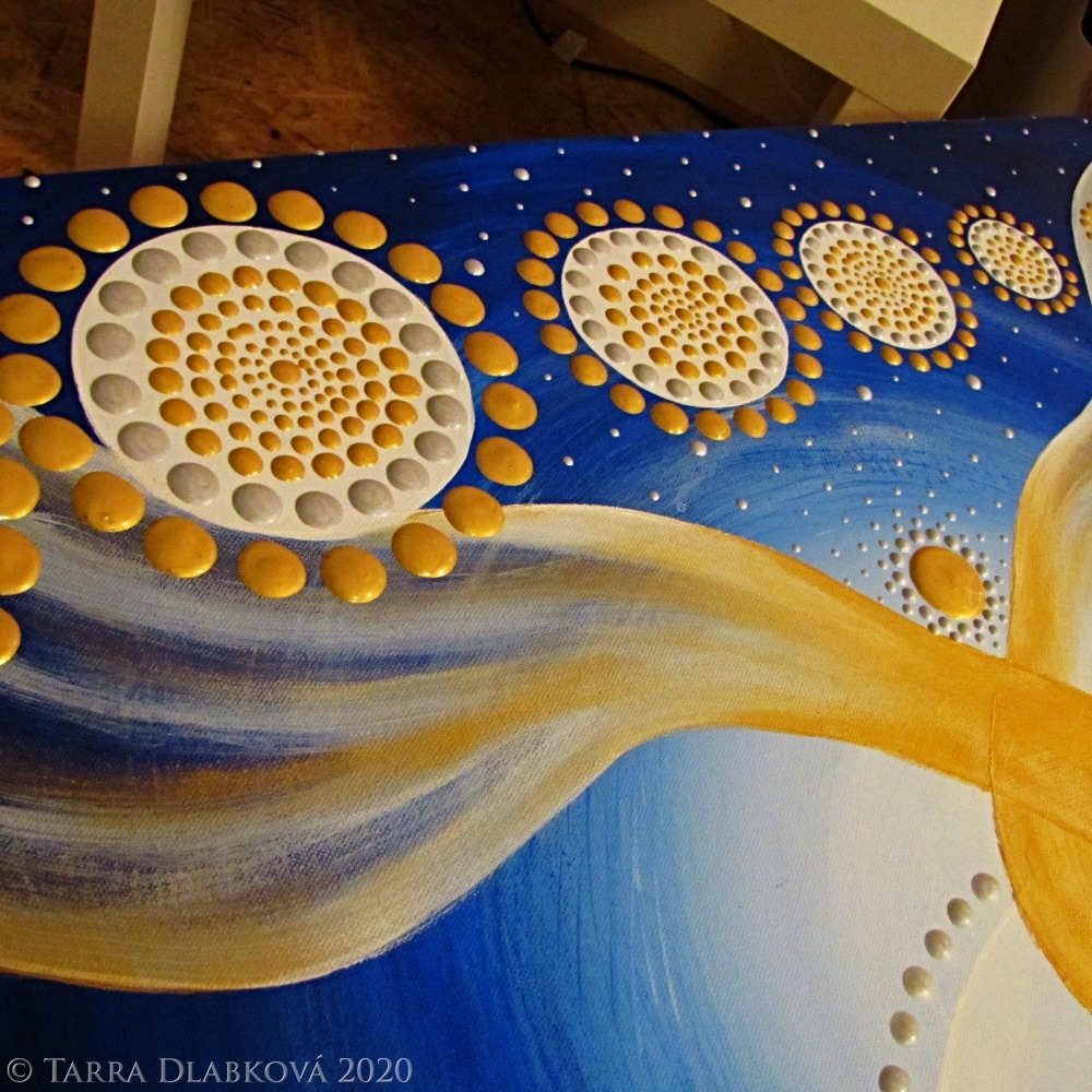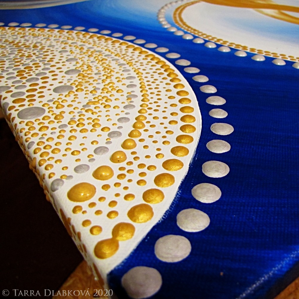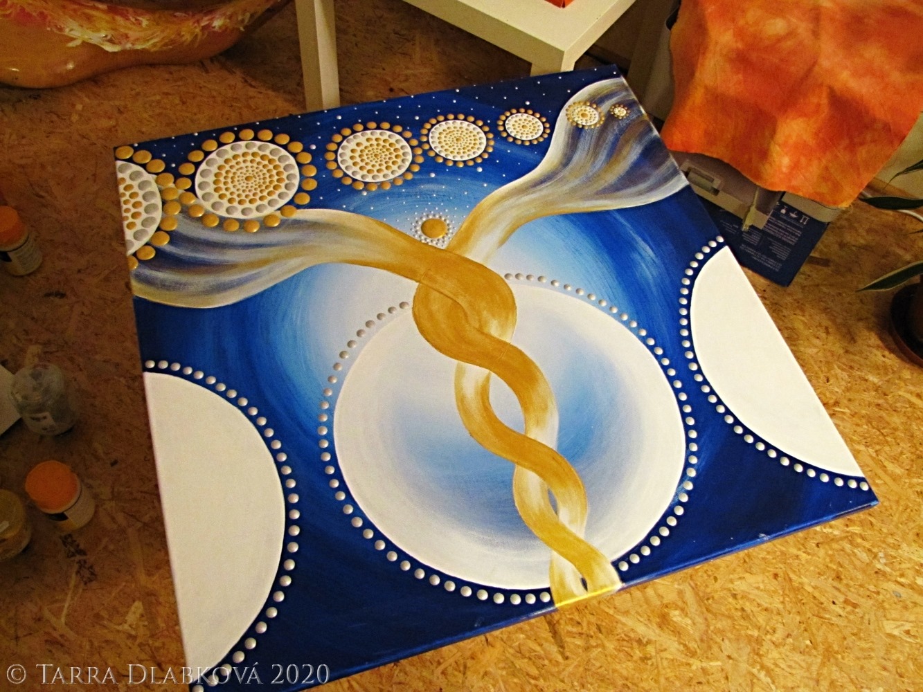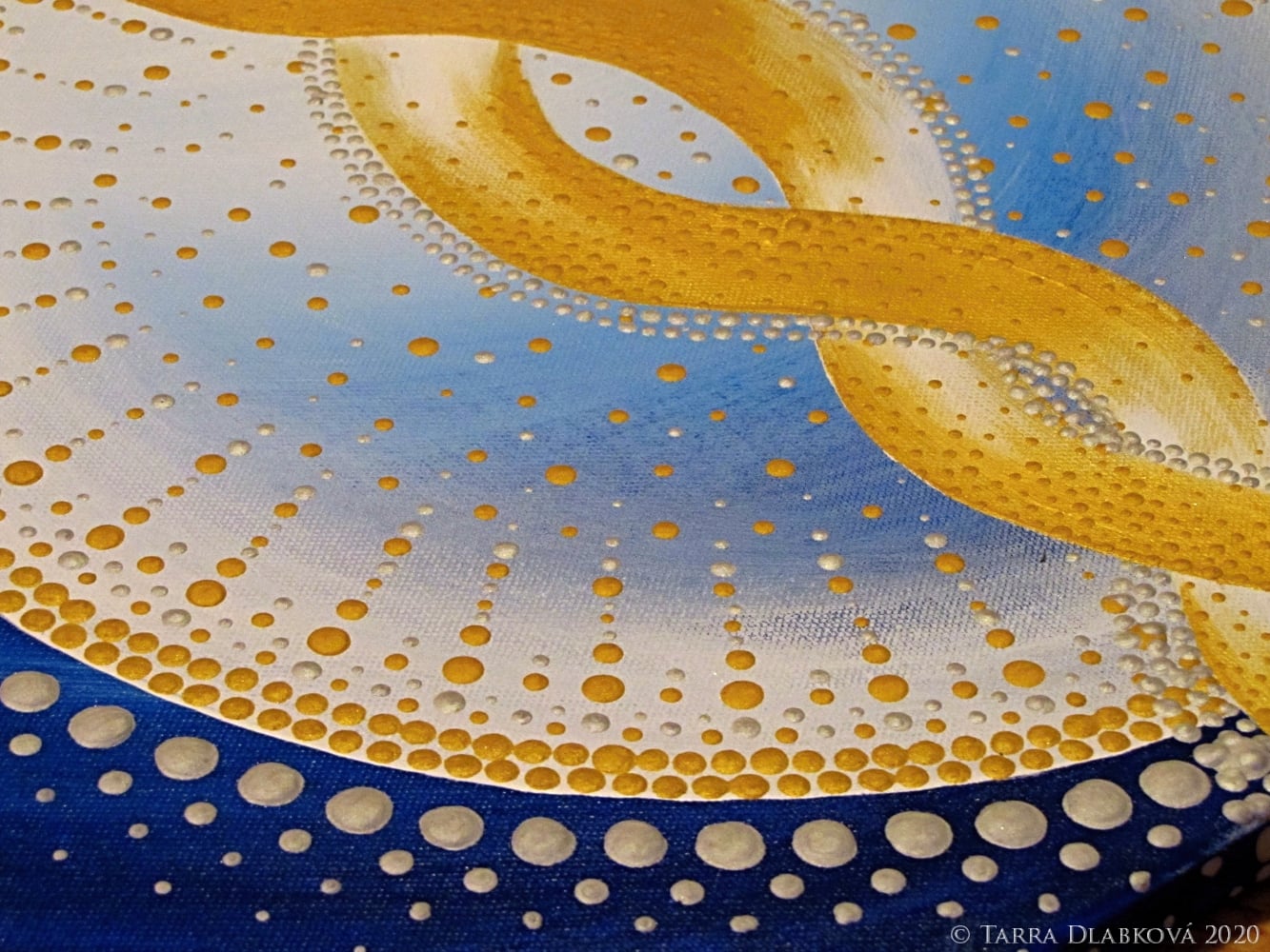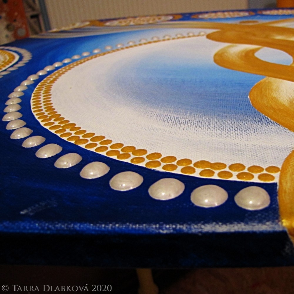 Akryl na plátně, z metalických barev zlatá (mírně mění odstín a leskne se dle osvětlení).