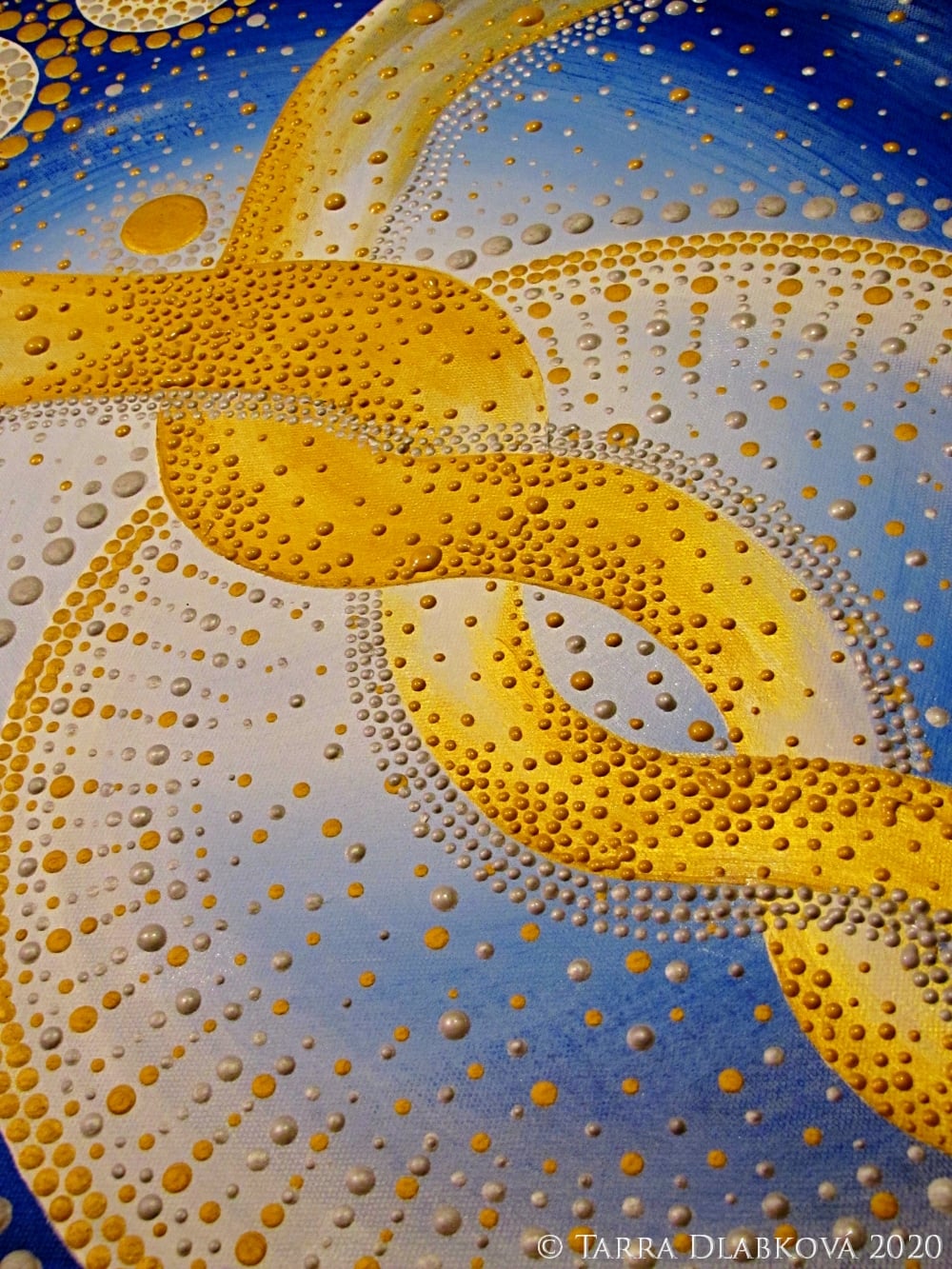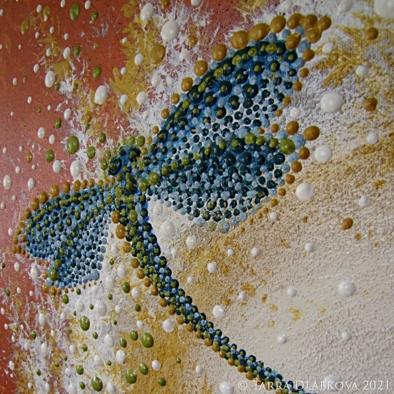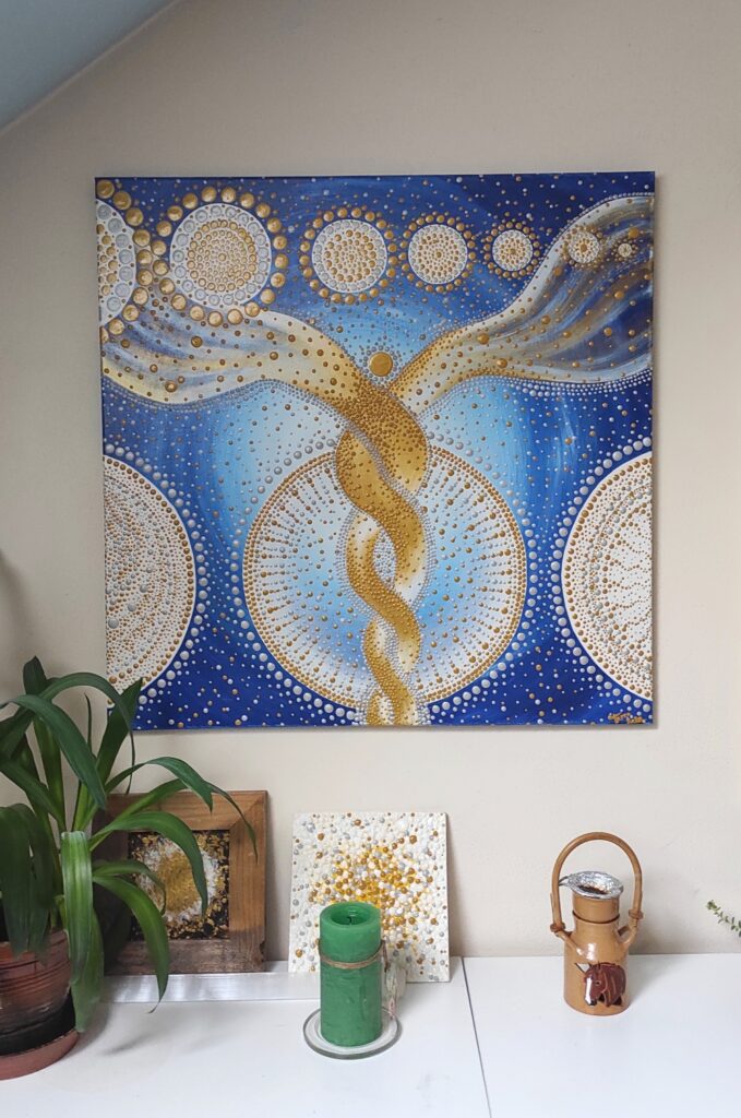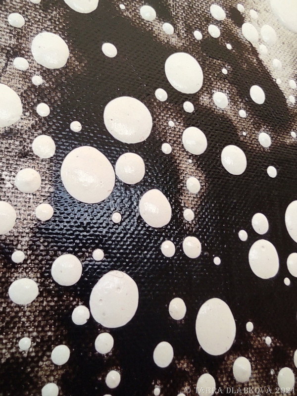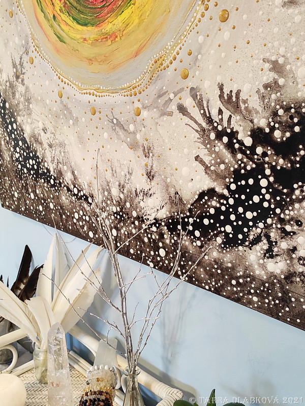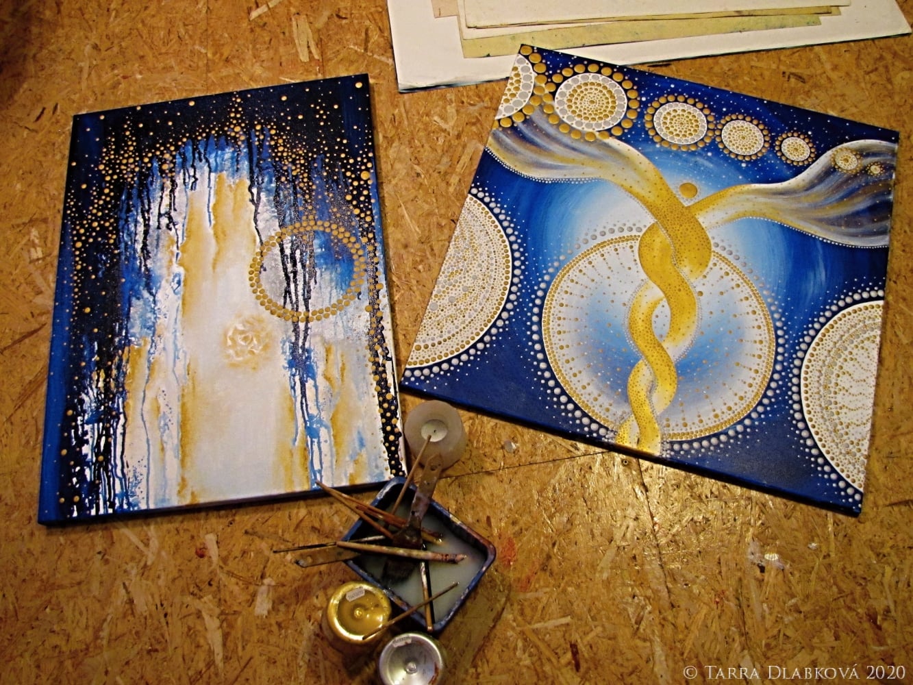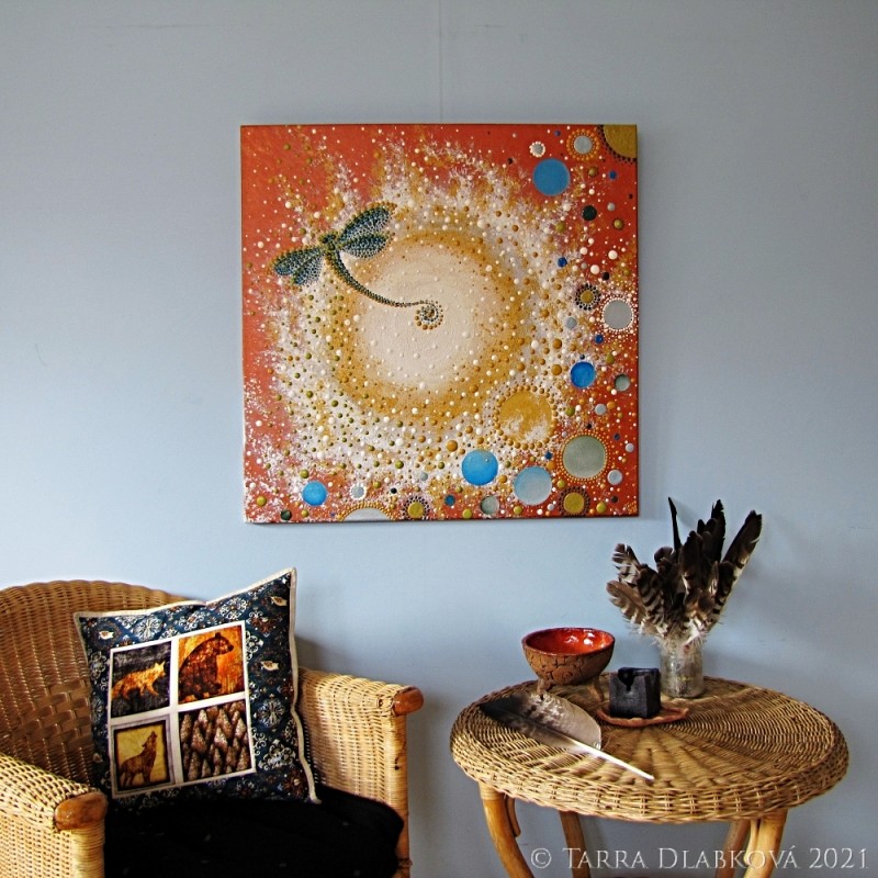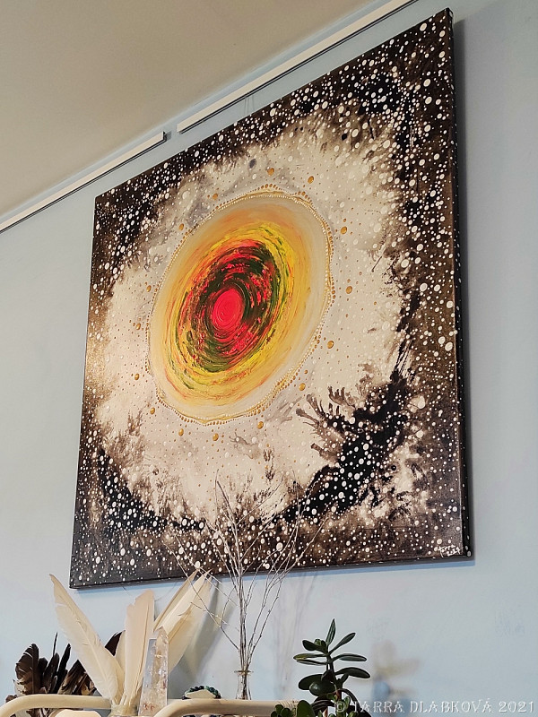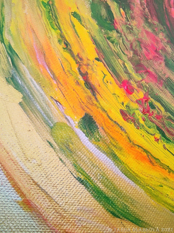 Akryl na plátně, z metalických barev zlatá (mírně mění odstín a leskne se dle osvětlení).