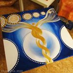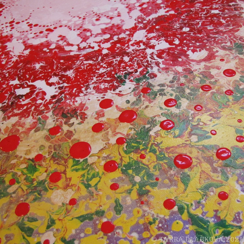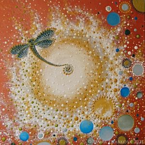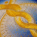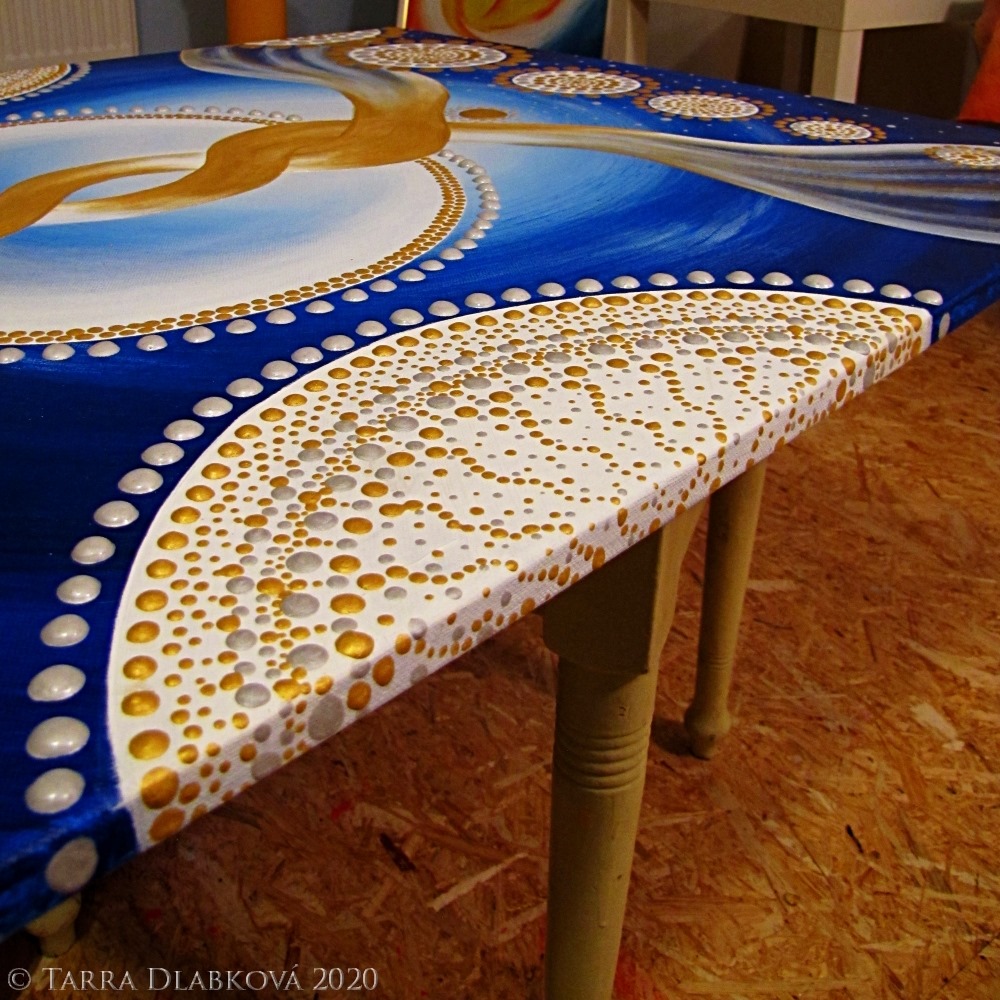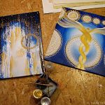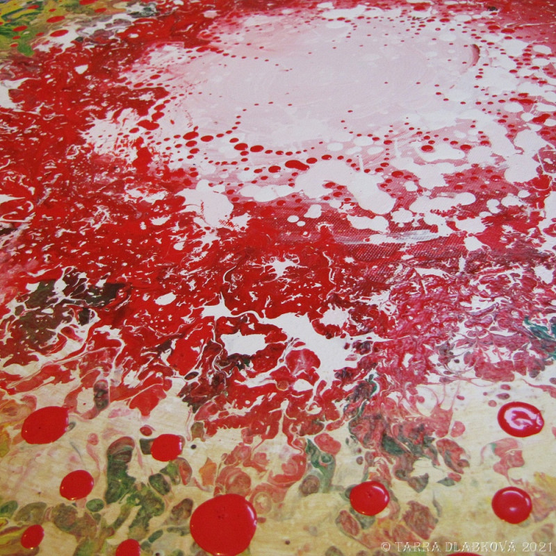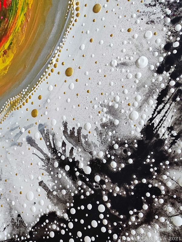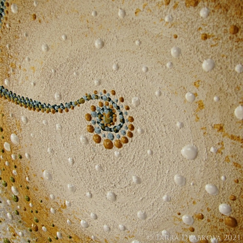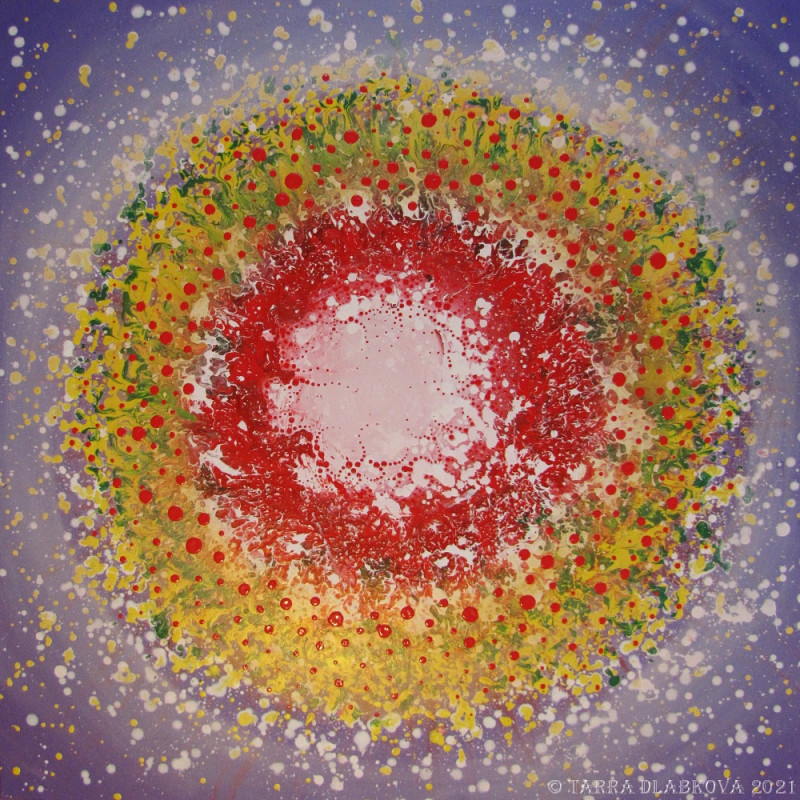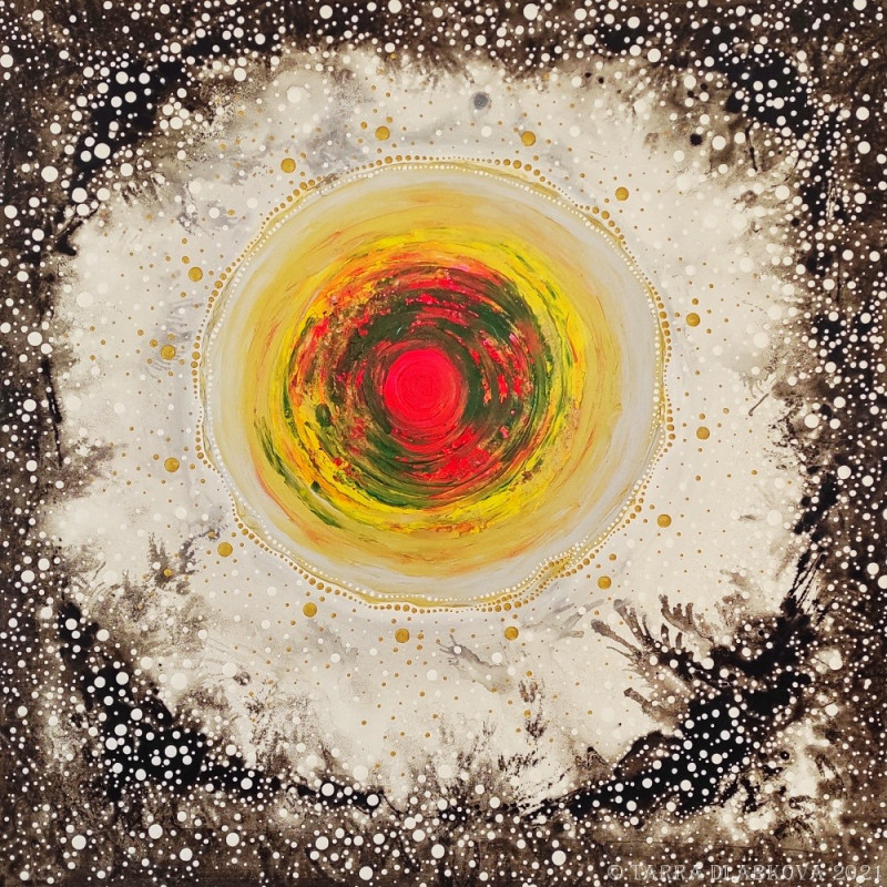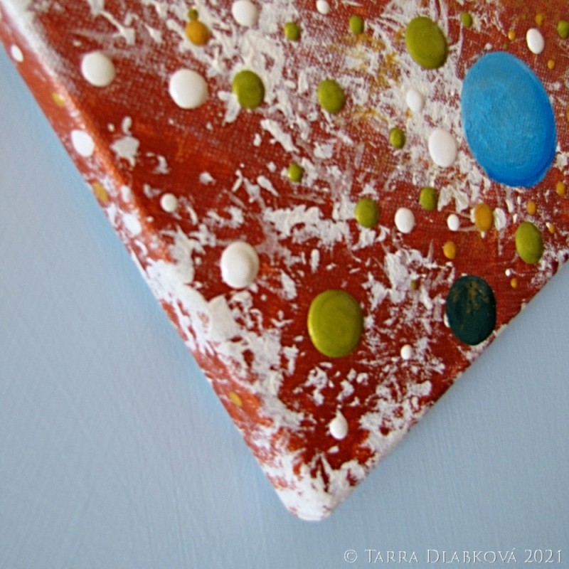 Akryl na plátně, z metalických barev zlatá (mírně mění odstín a leskne se dle osvětlení).