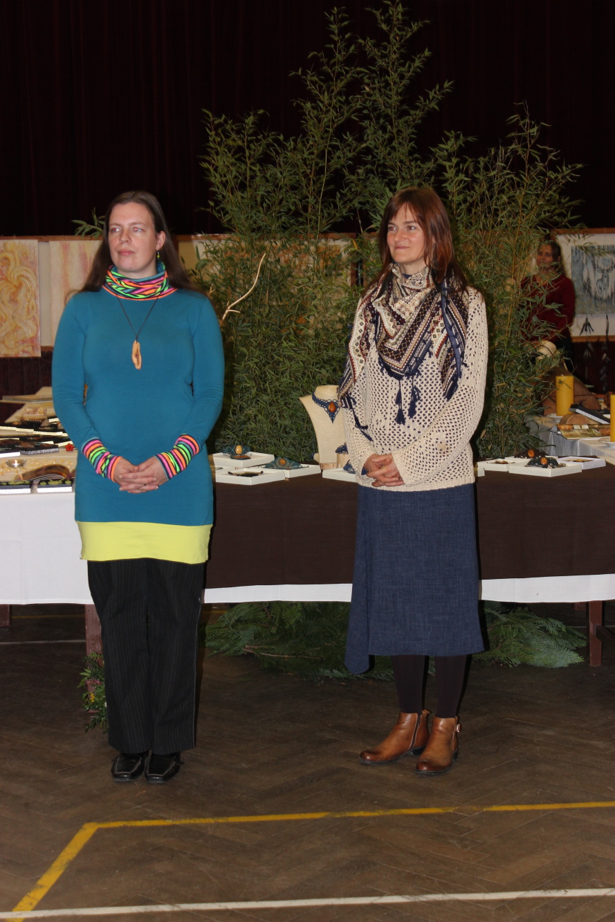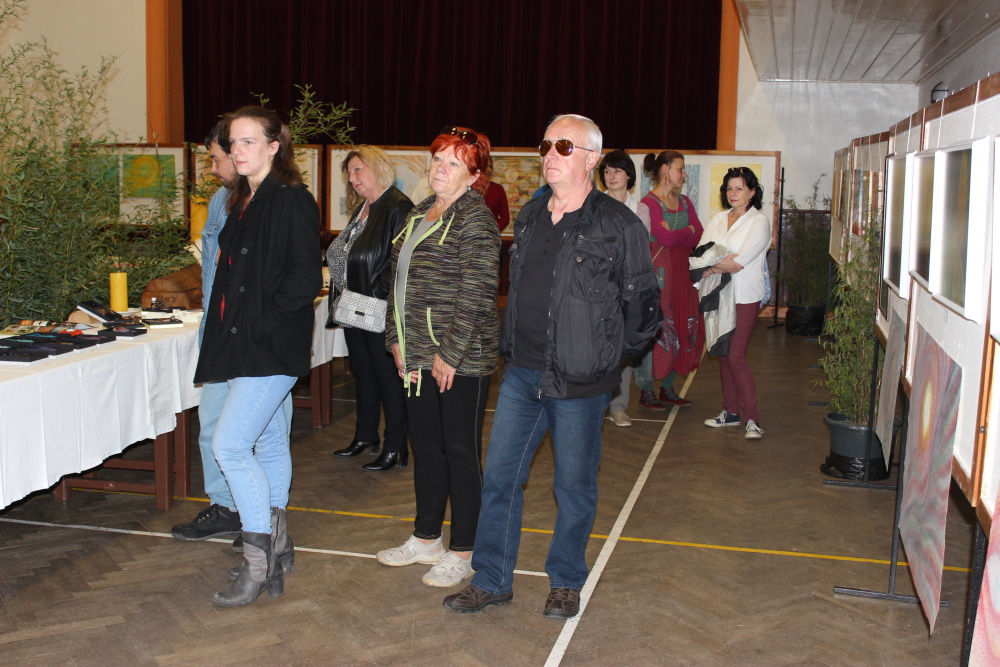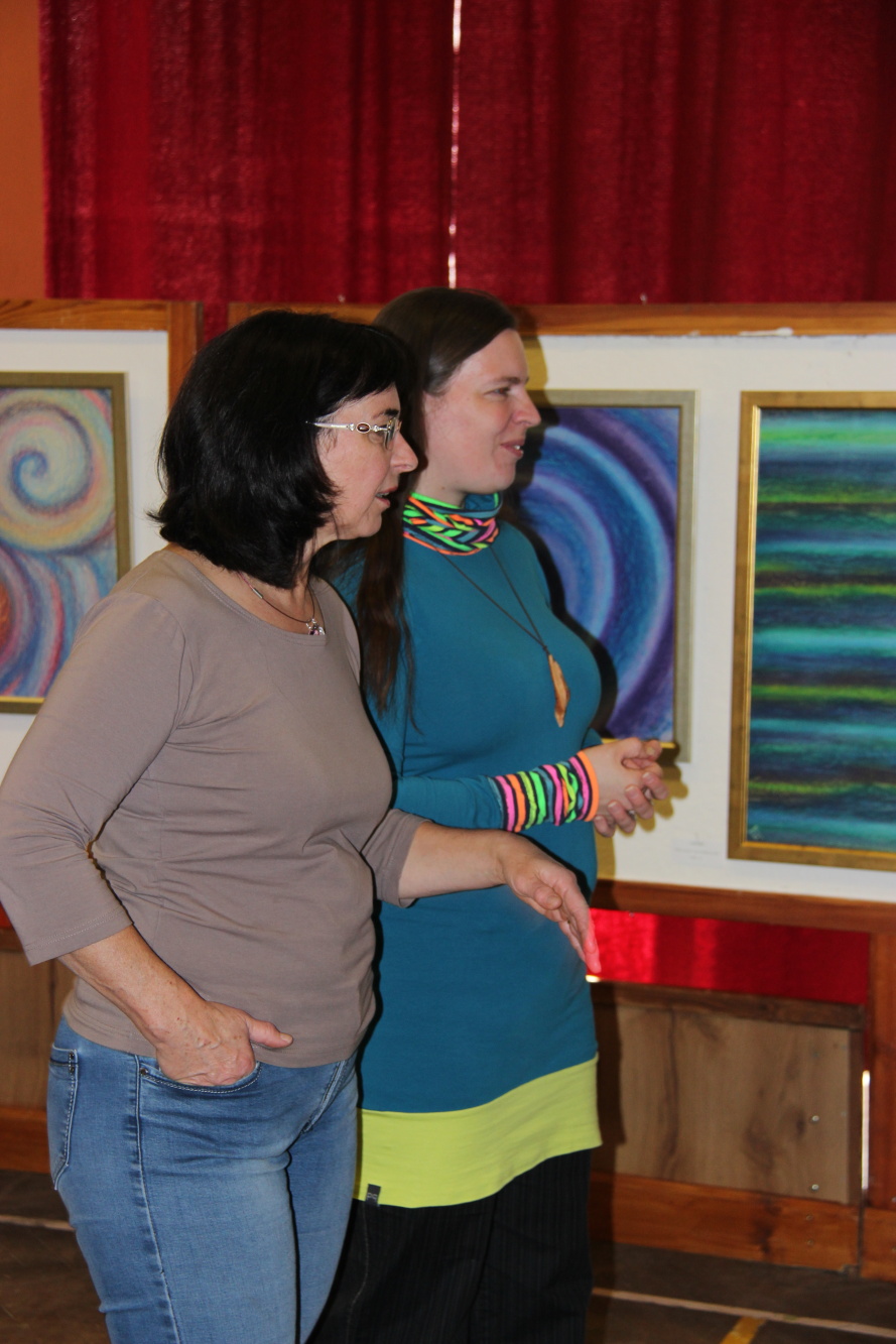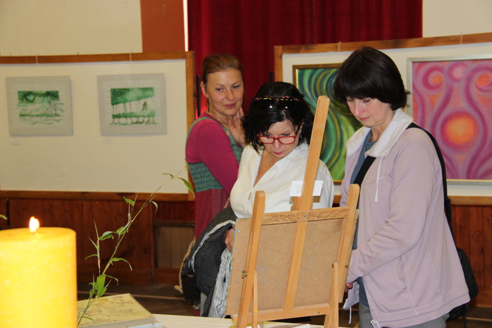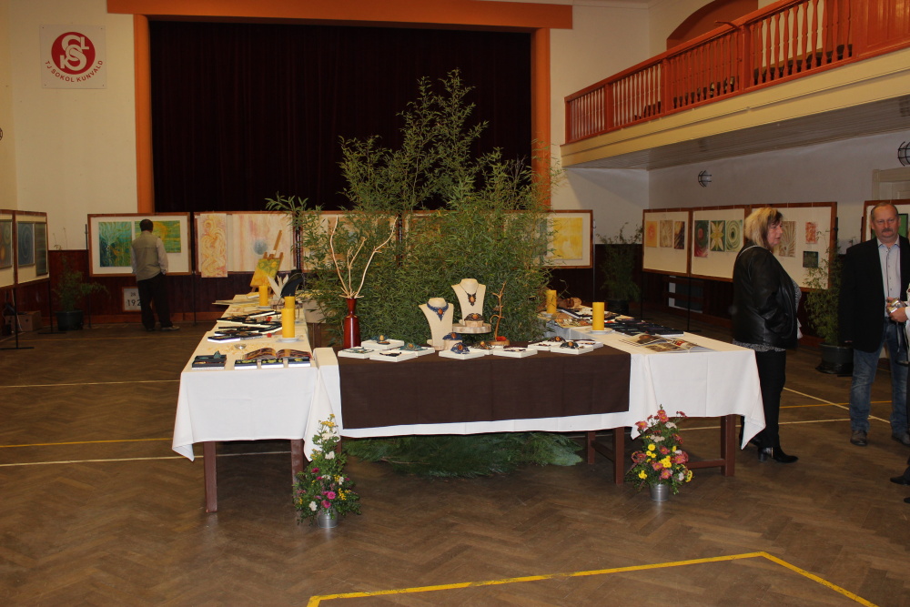 Kunvaldská sokolovna se jednoho podzimního dne proměnila v kouzelný ostrov plný zeleně, zpěvu ptáků a vůně pryskyřice. Společně s Haniou Heřmanovou (t.č. Jeništovou) jsme vymazlily prostor svými díly – já obrazy, ona šperky. K vidění byla i naše společná rozpracovaná série Tři podoby ženy, obrazy hotové i rozmalované, dřeva, dřevíčka, šperky pro každodenní nošení i třeba svatební kolekce. Na vernisáži i v následujících dnech jsme naživo ukazovaly proces naší tvorby.