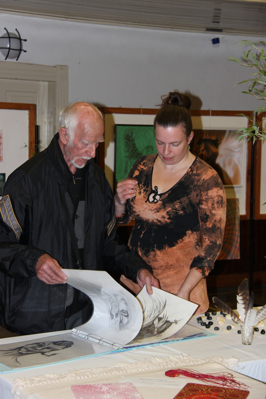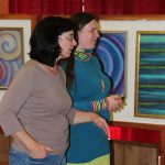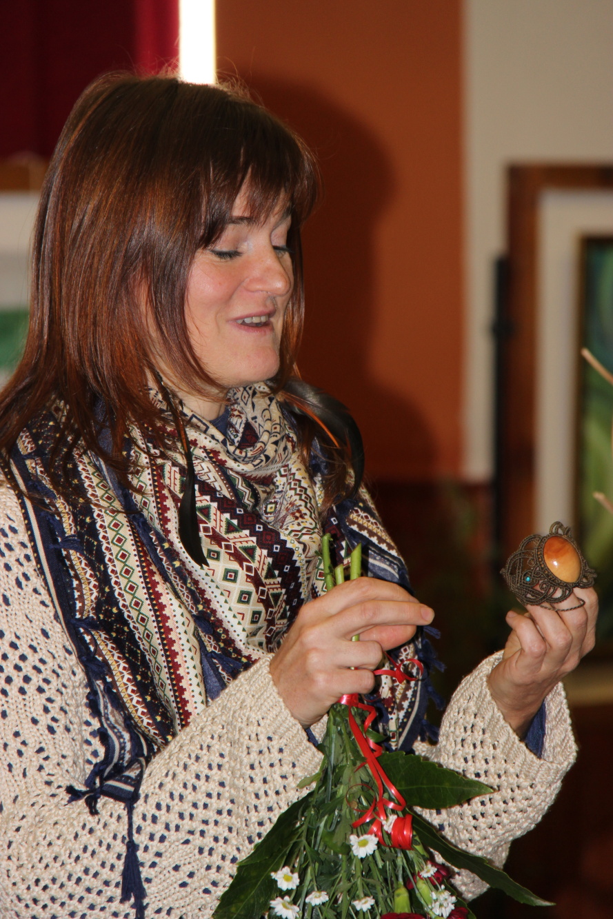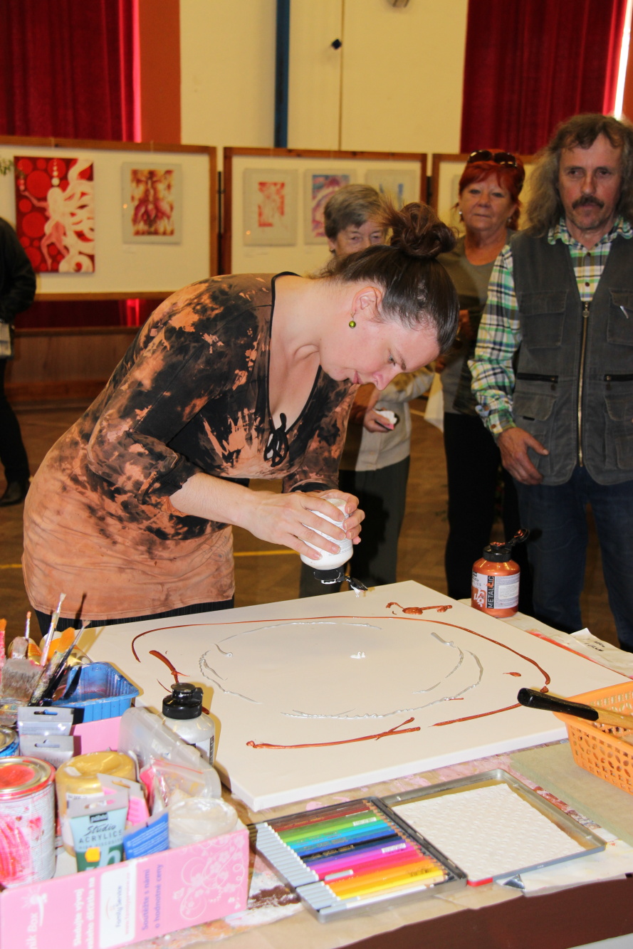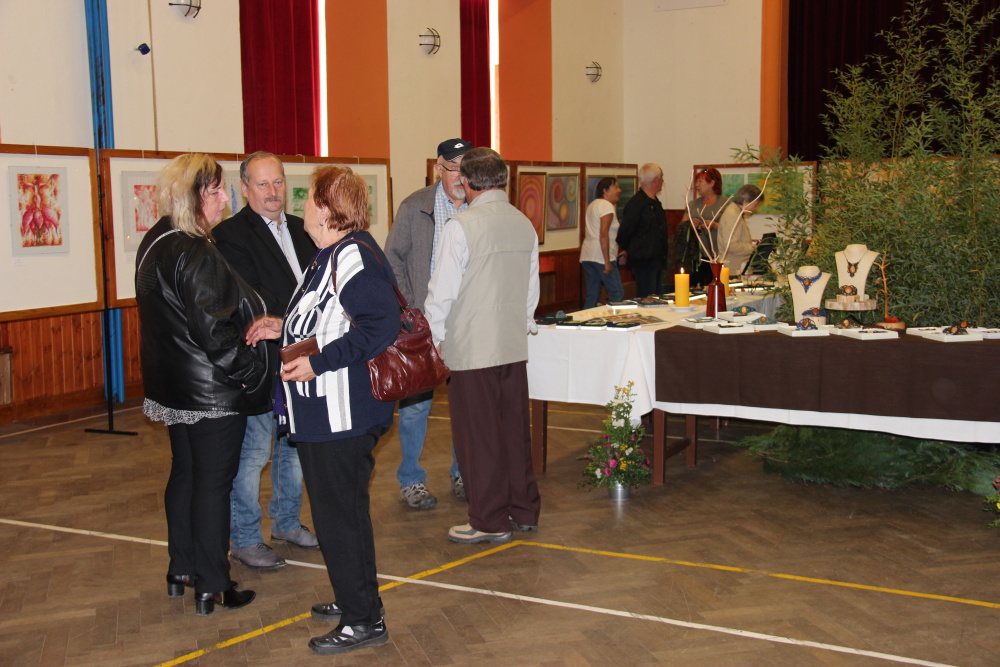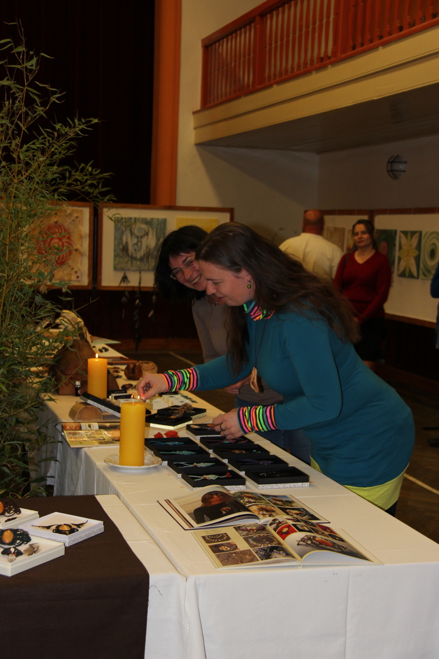 Kunvaldská sokolovna se jednoho podzimního dne proměnila v kouzelný ostrov plný zeleně, zpěvu ptáků a vůně pryskyřice. Společně s Haniou Heřmanovou (t.č. Jeništovou) jsme vymazlily prostor svými díly – já obrazy, ona šperky. K vidění byla i naše společná rozpracovaná série Tři podoby ženy, obrazy hotové i rozmalované, dřeva, dřevíčka, šperky pro každodenní nošení i třeba svatební kolekce. Na vernisáži i v následujících dnech jsme naživo ukazovaly proces naší tvorby.