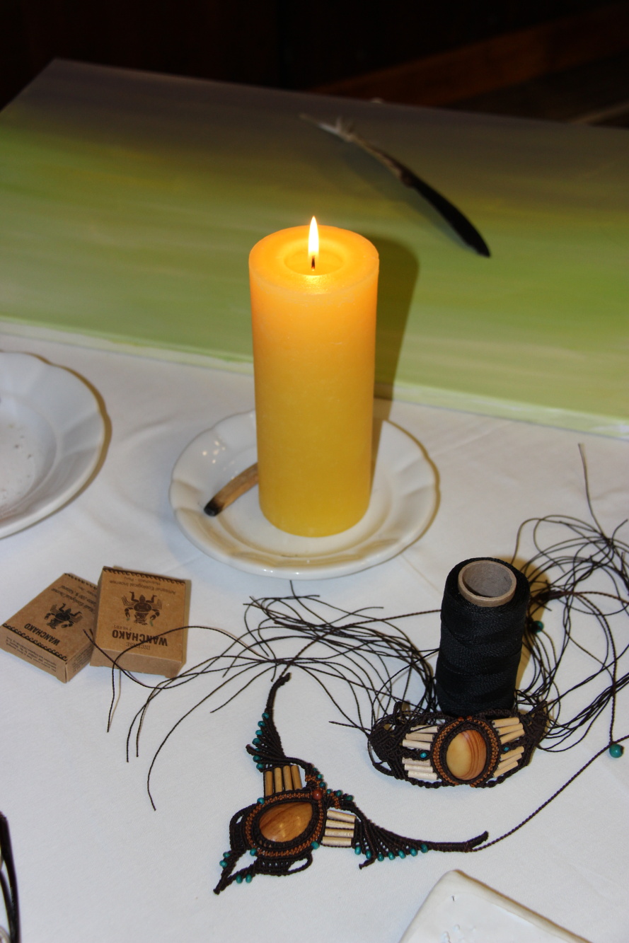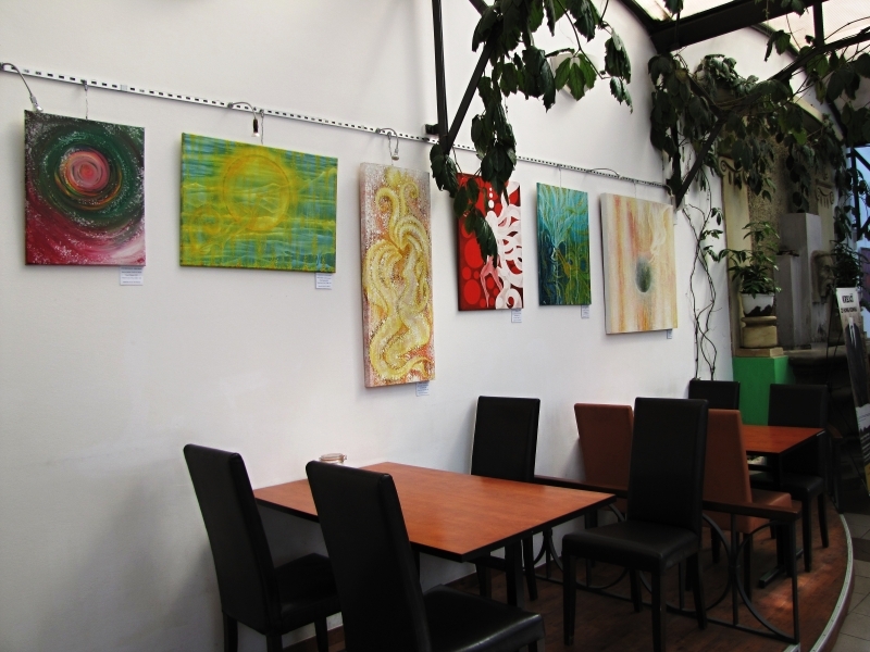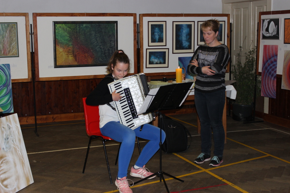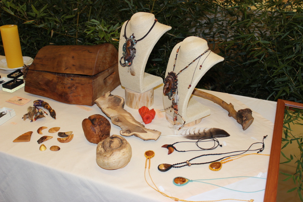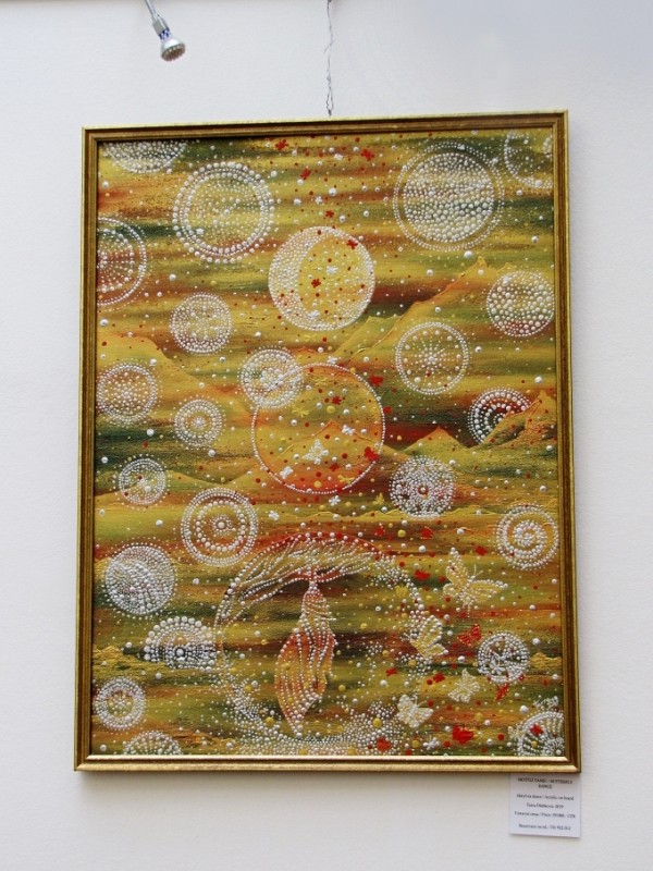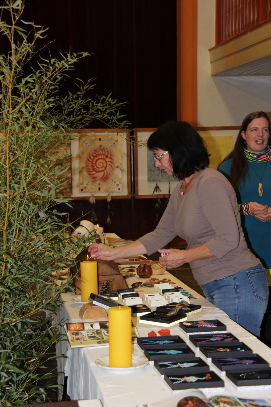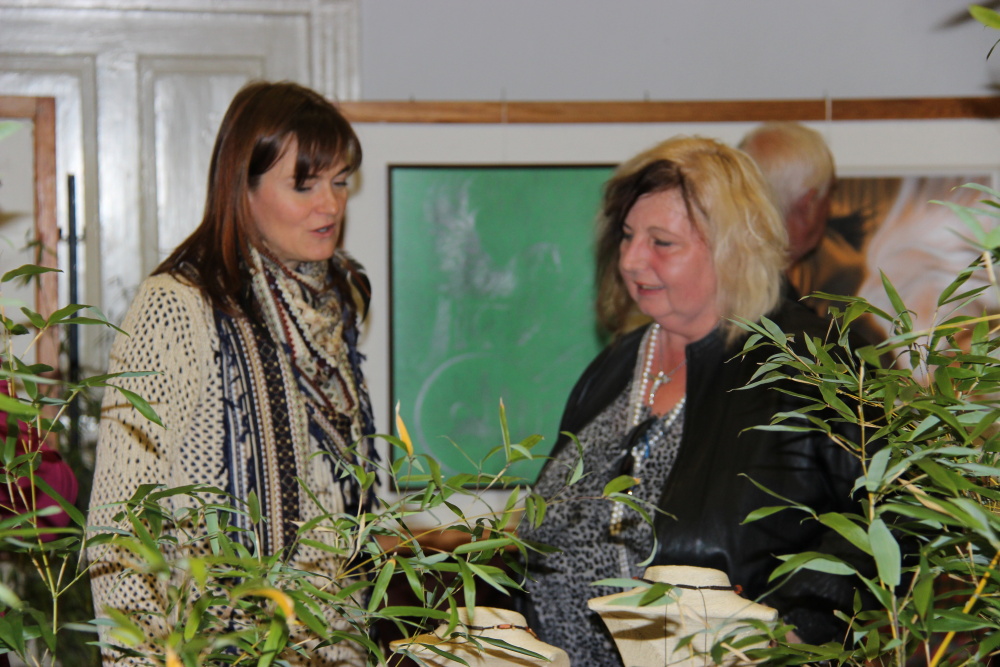 Kunvaldská sokolovna se jednoho podzimního dne proměnila v kouzelný ostrov plný zeleně, zpěvu ptáků a vůně pryskyřice. Společně s Haniou Heřmanovou (t.č. Jeništovou) jsme vymazlily prostor svými díly – já obrazy, ona šperky. K vidění byla i naše společná rozpracovaná série Tři podoby ženy, obrazy hotové i rozmalované, dřeva, dřevíčka, šperky pro každodenní nošení i třeba svatební kolekce. Na vernisáži i v následujících dnech jsme naživo ukazovaly proces naší tvorby.