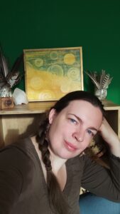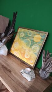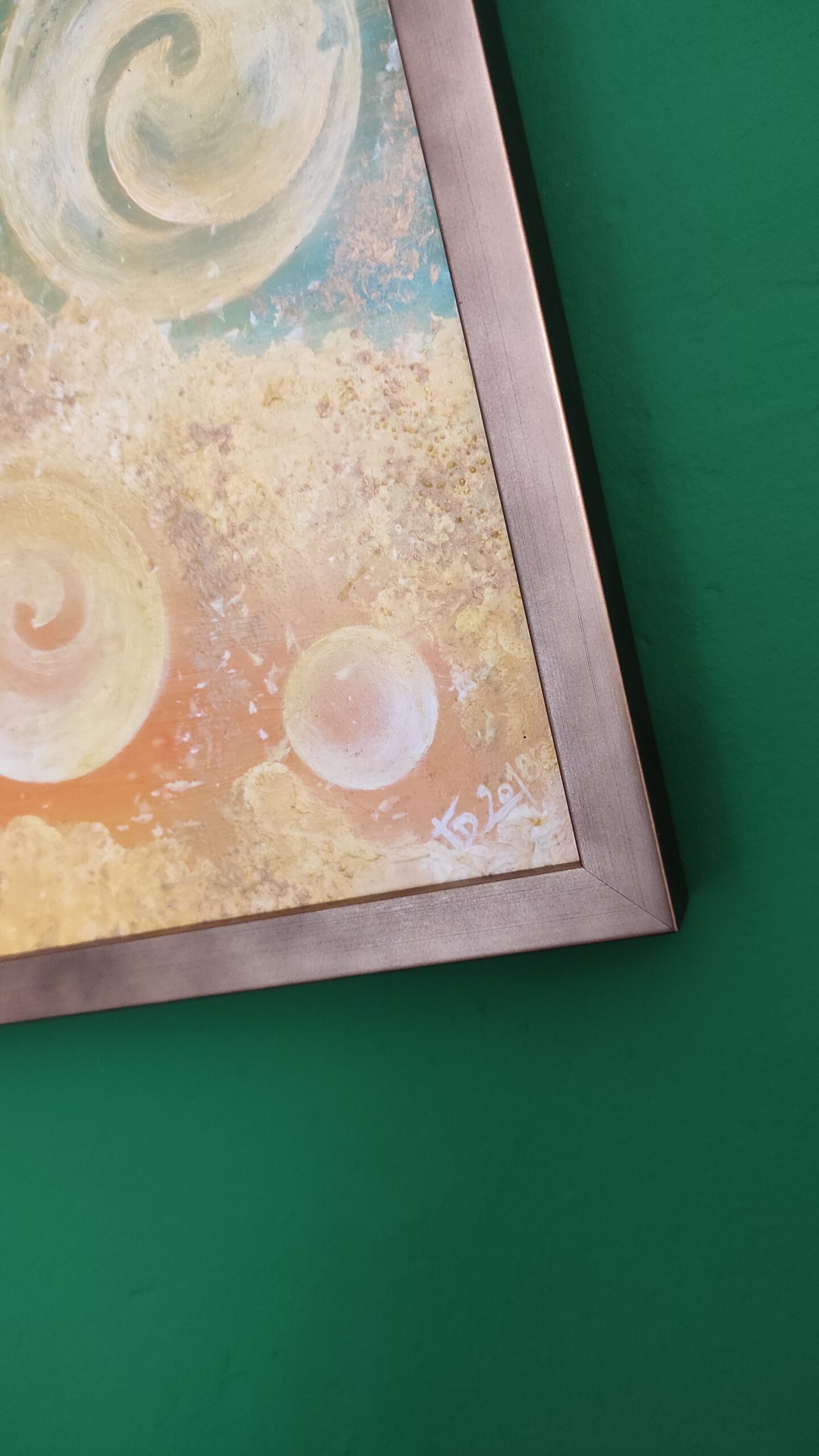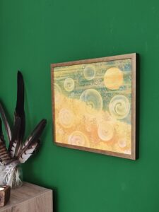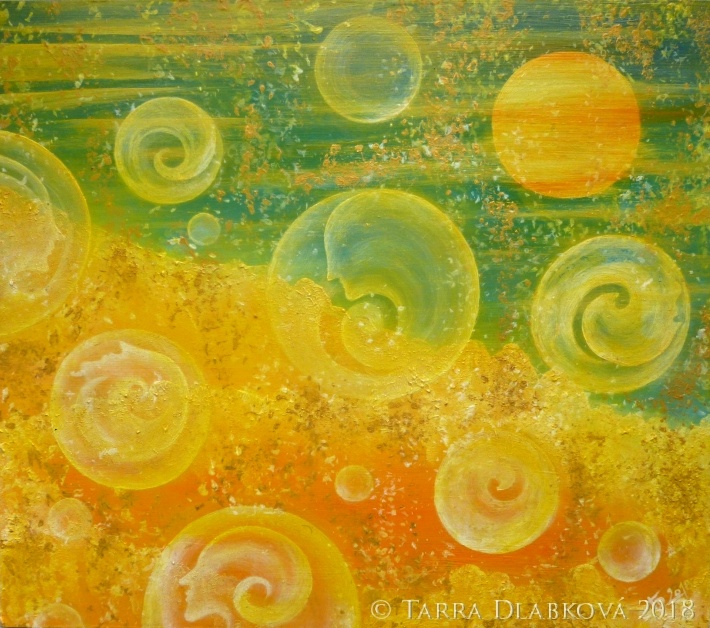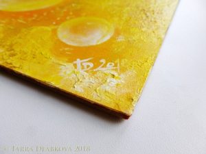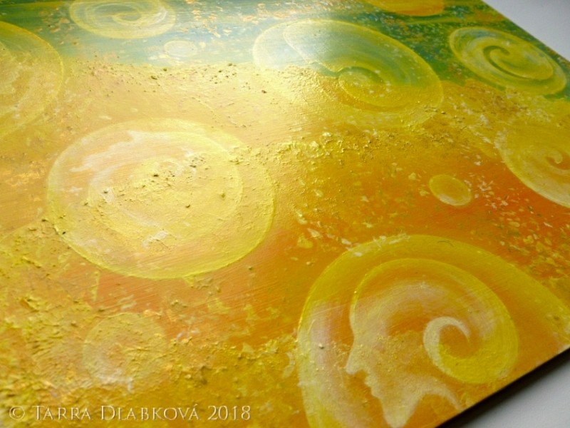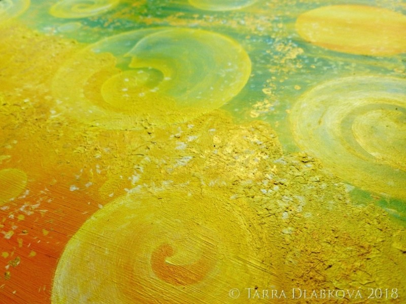 Olej a akryl na sololitové desce, použita i metalická zlatá barva (leskne se a mění lehce odstín dle osvětlení).