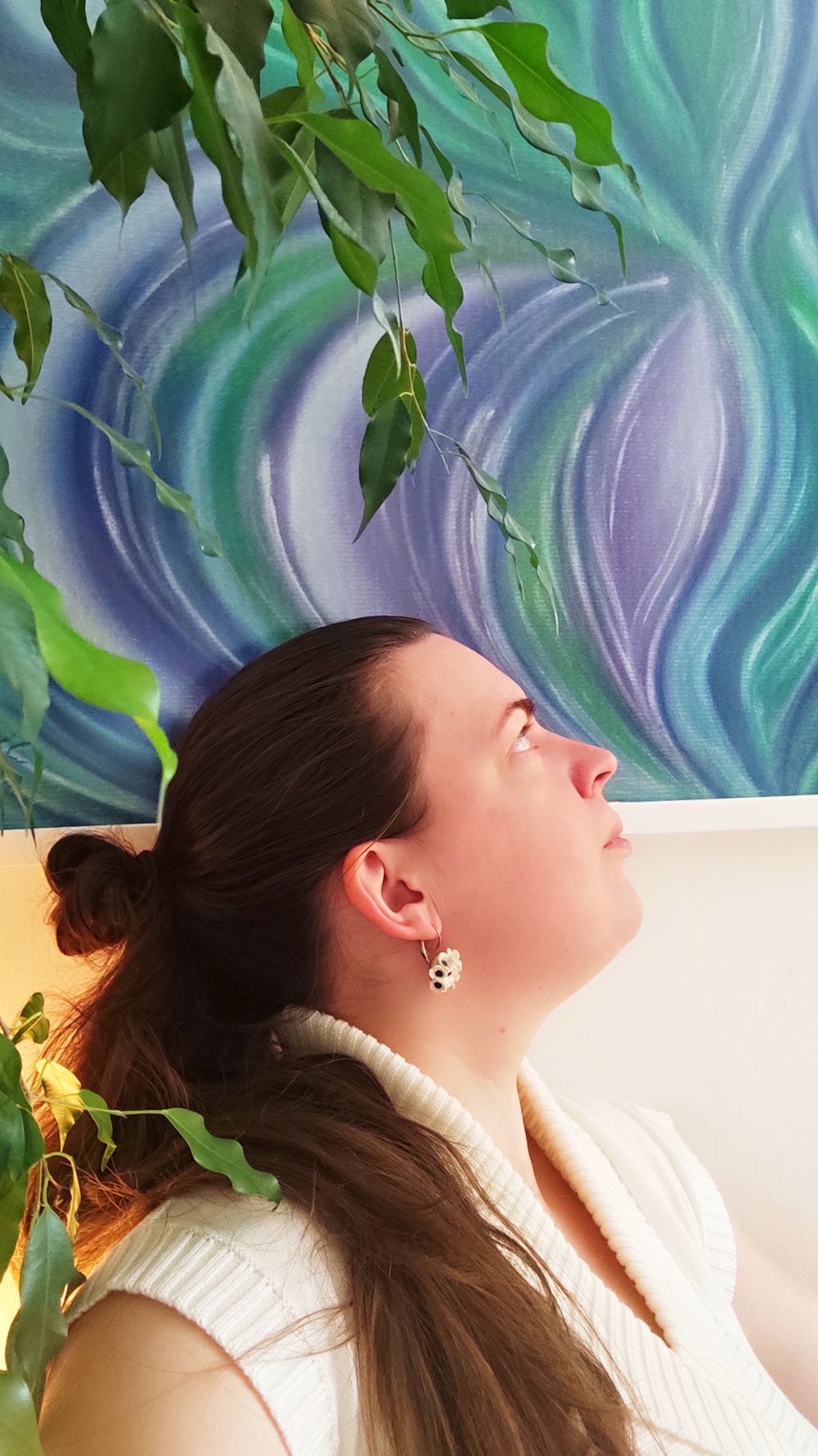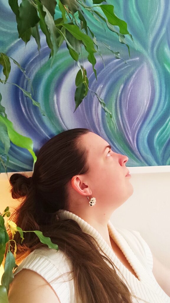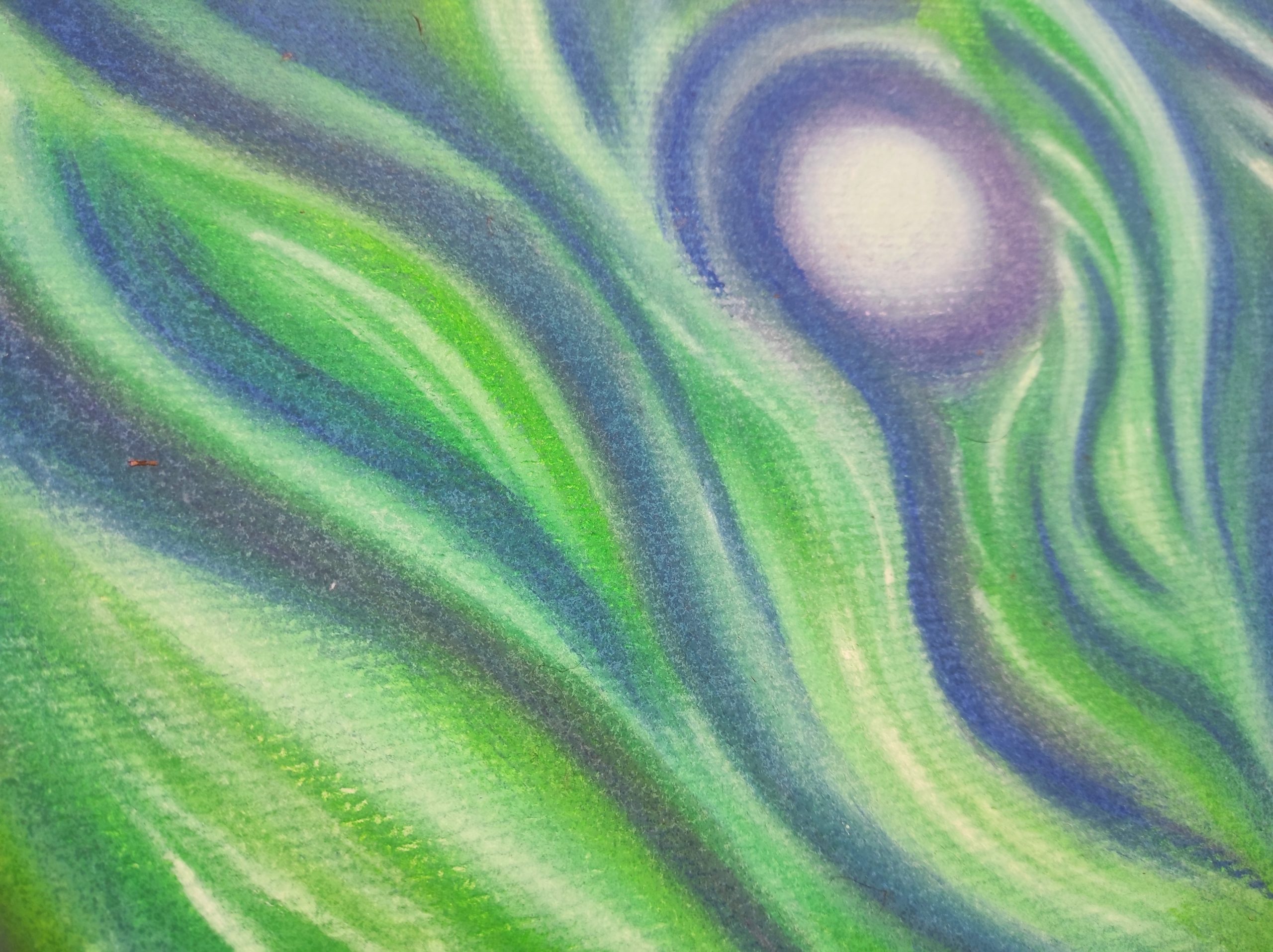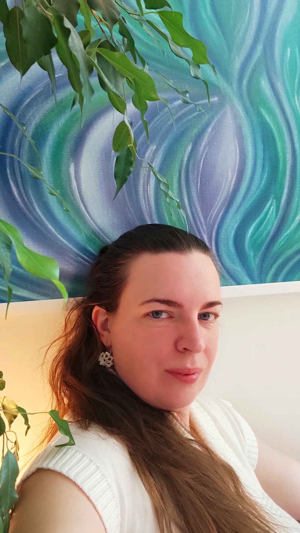 Ve struktuře samotné malby i barev vidím vlnky na jezeře, jeho břehy i hloubku, a nekonečný vtahující vír… Když se nadechnu, tak z malby doslova cítím vodu a mocný vír ohně.