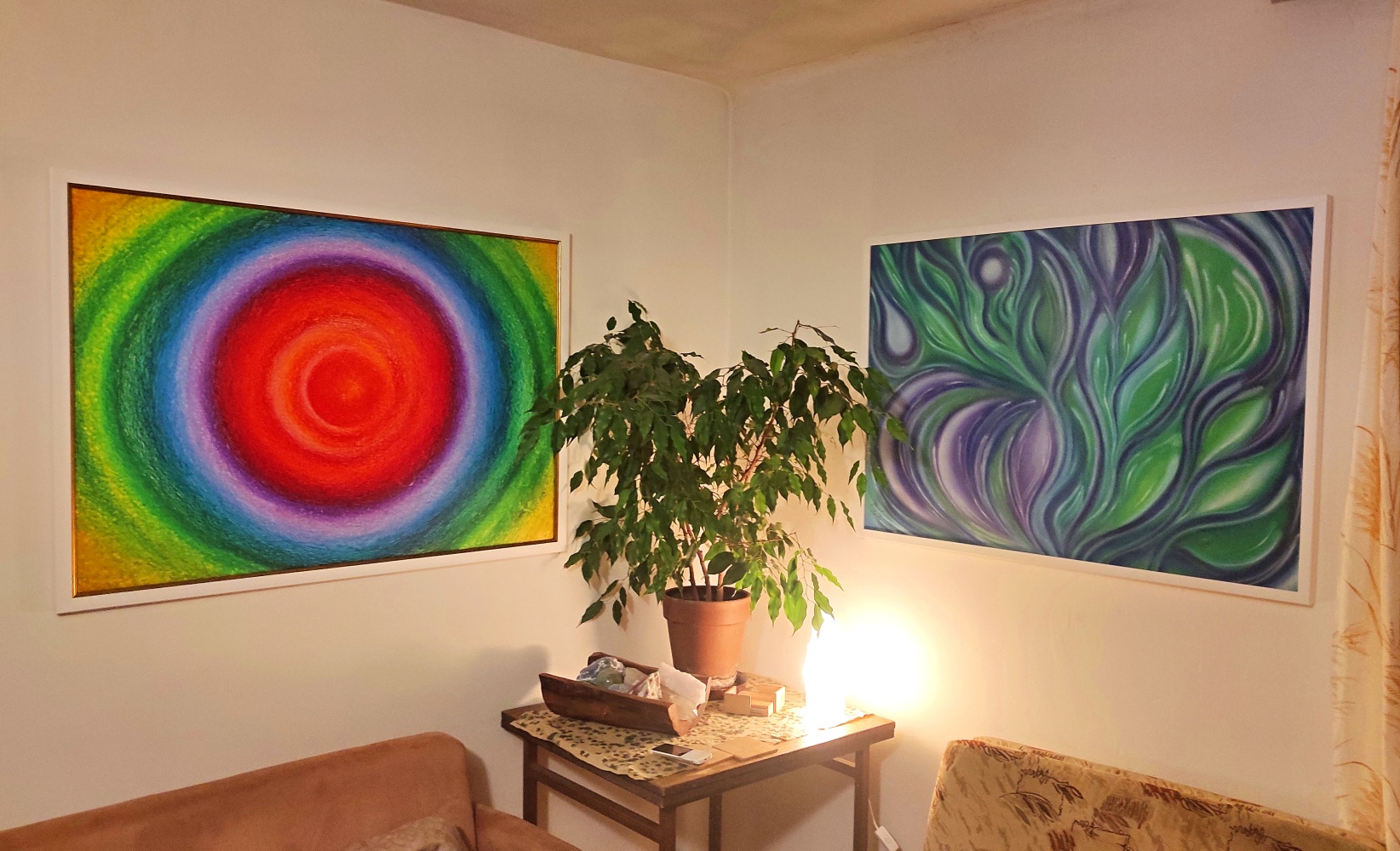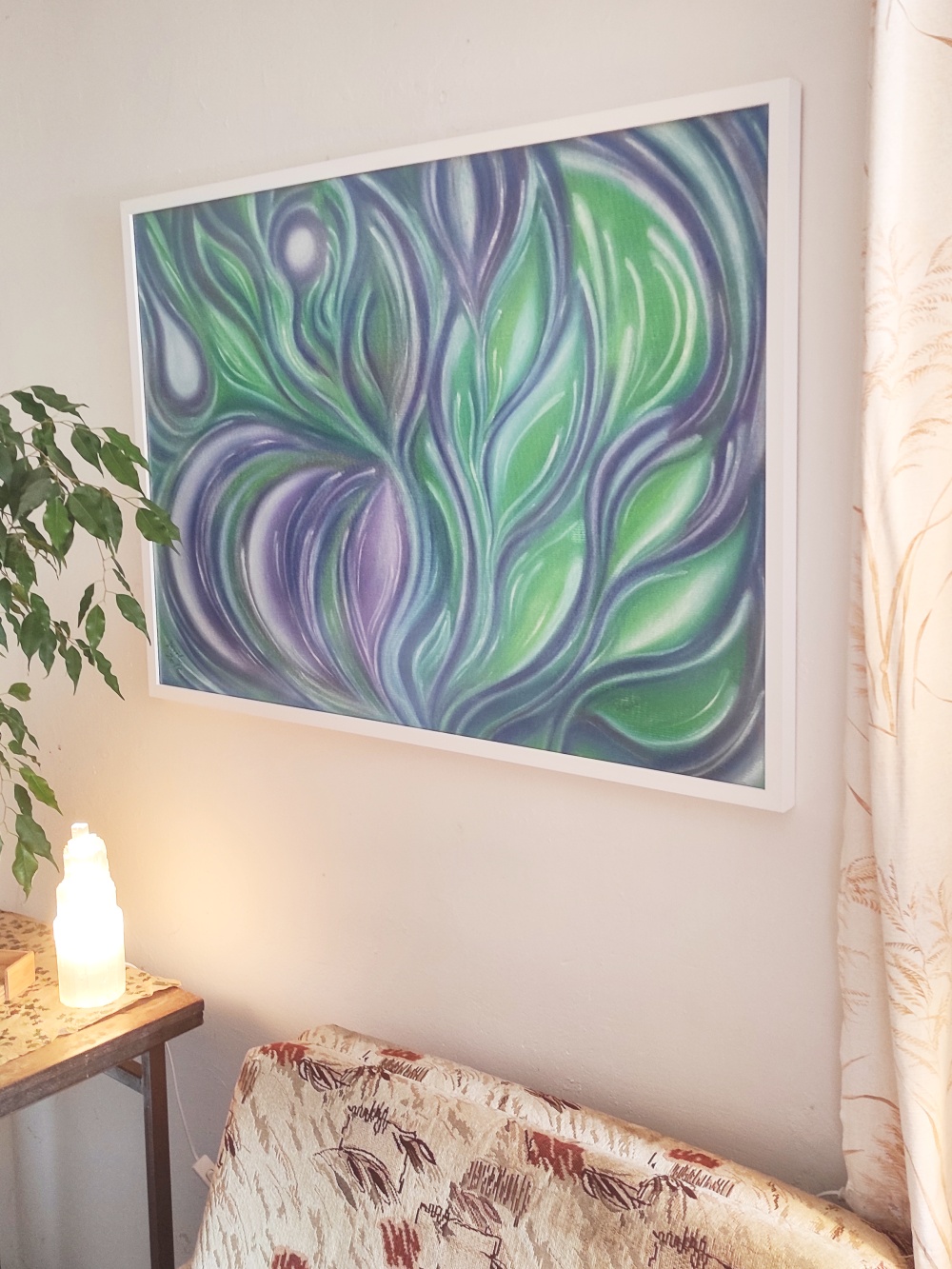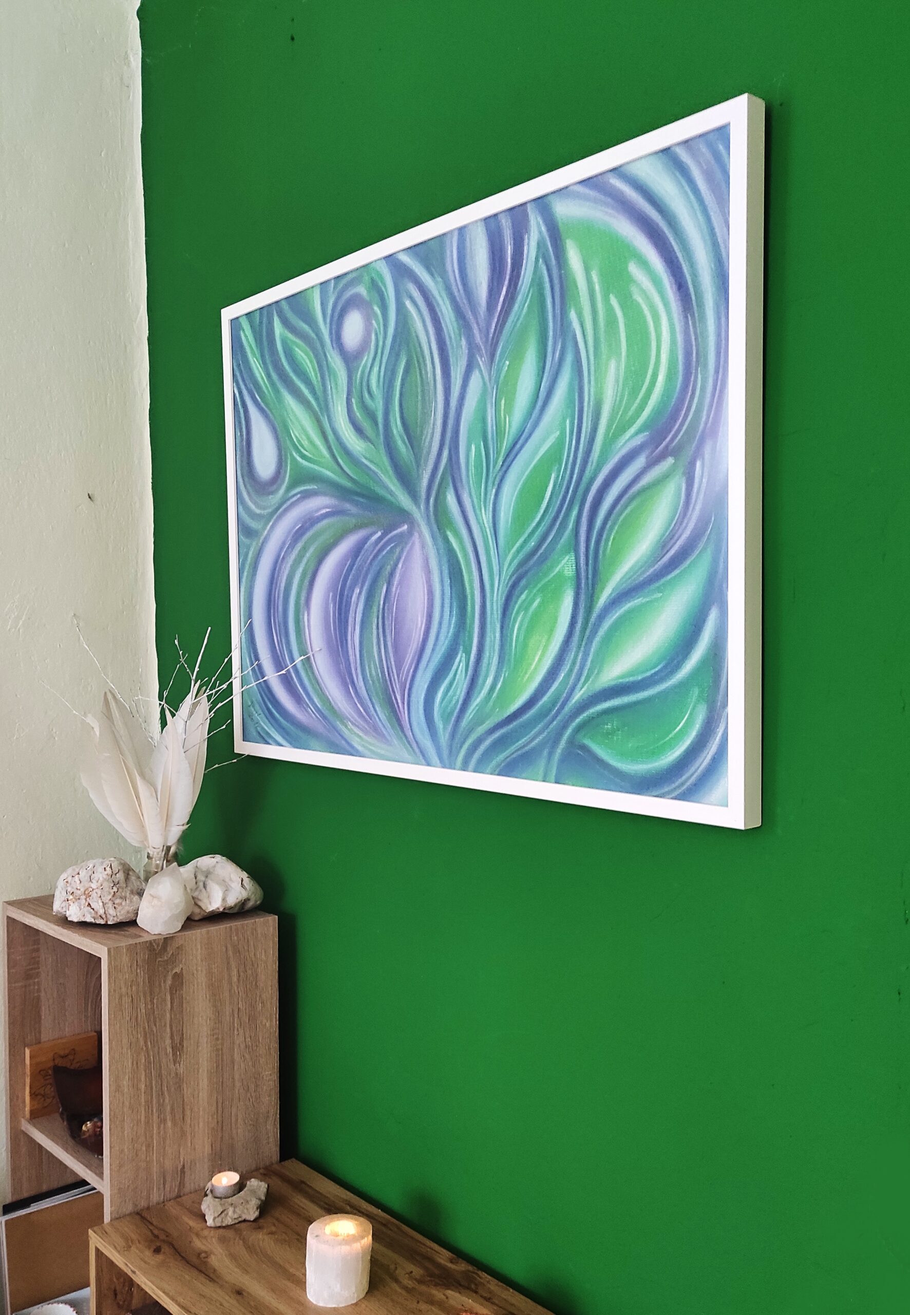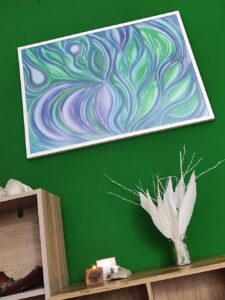 Harmonizační obraz jemných odstínů duhy, hry barev. Obraz o jemnosti a ženskosti, ponoření se do vody ženského nitra, kde vykvétají krásné květy, ale také zde hoří ohnivé plameny vášně. Obraz pro ženy k rozvíjení ženskosti a pro muže k navnímání žen… 🙂