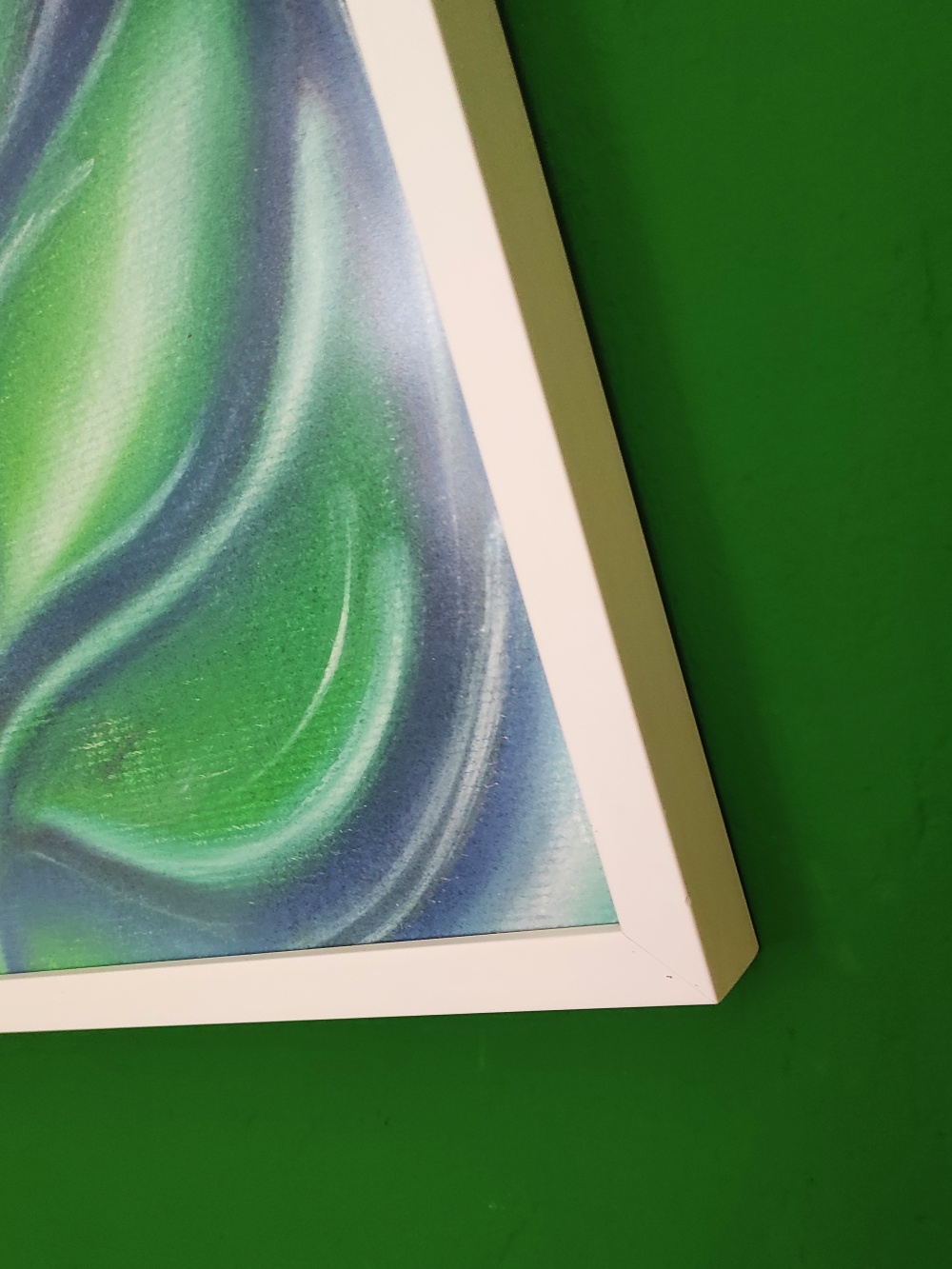 Zarámováno v tvarovaném bílém rámu, který kresbu vynáší dopředu a zvýrazňuje ji tak. Zaskleno antireflexním sklem.
