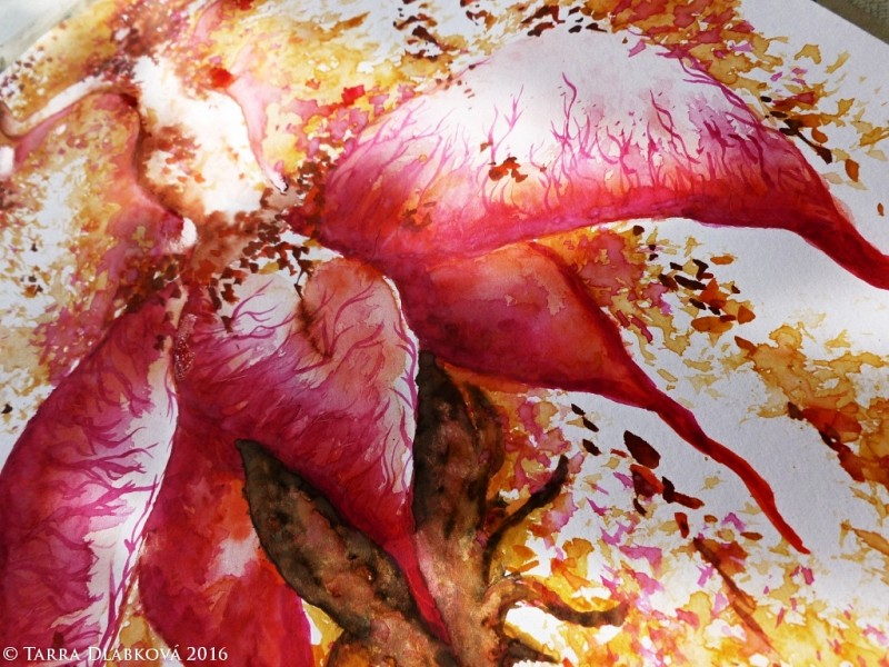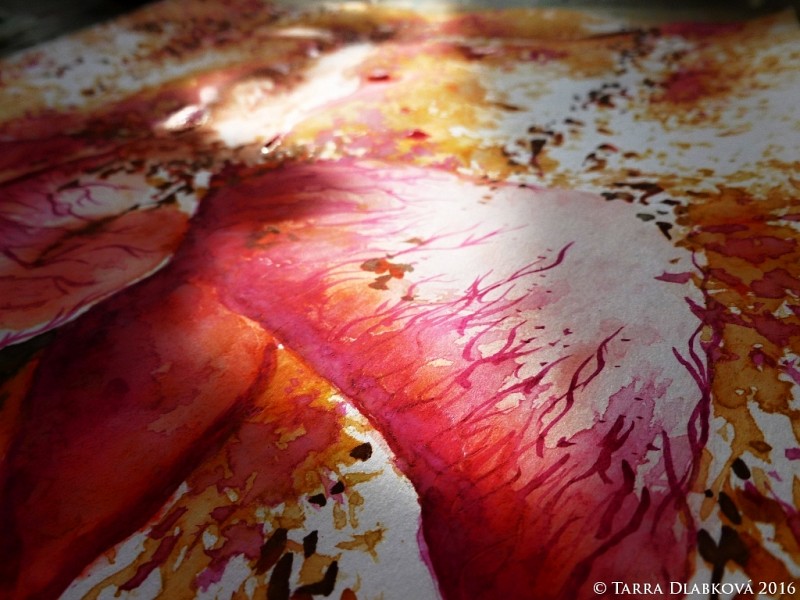 První jarní paprsky, šťavnatost radosti, rozkvět ženství. To je Bohyně, Vesna, Žena v plné síle. Spojená s přírodou a cykly. Přijmá a dává. Září a svítí. Akvarel….