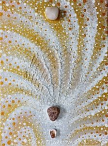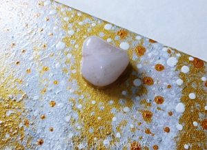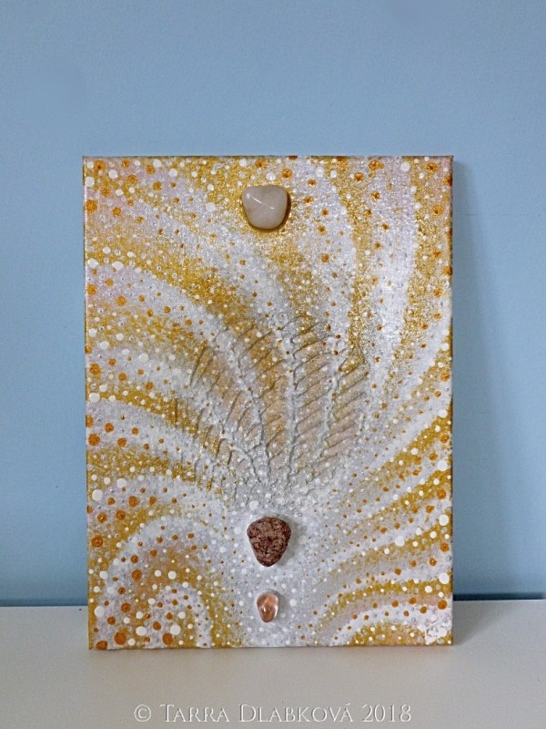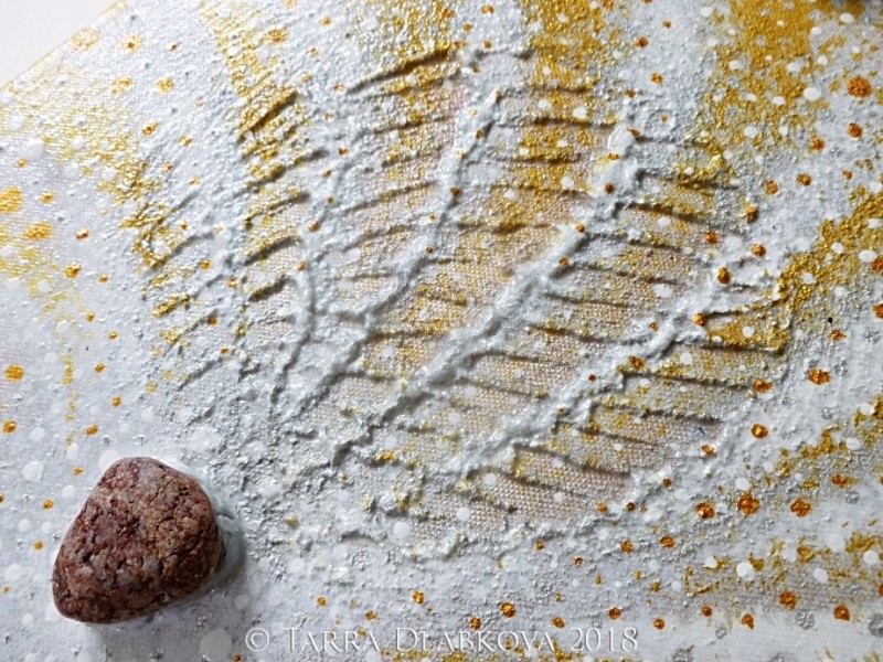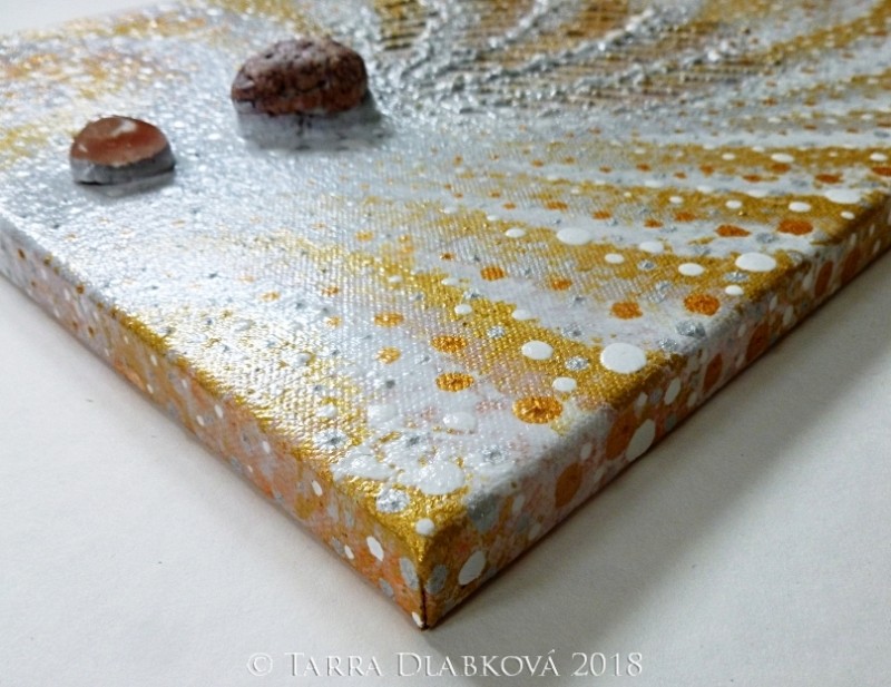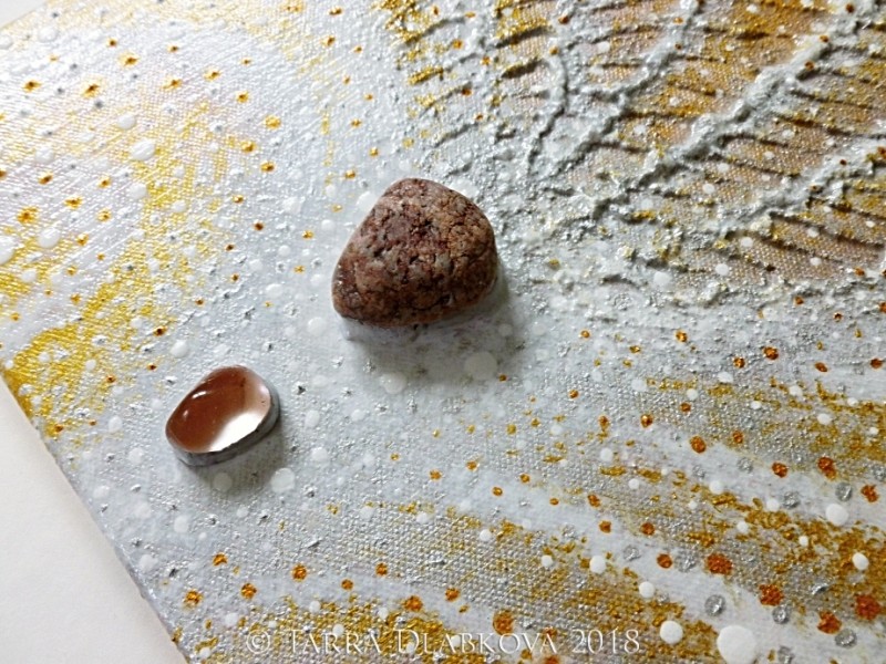 Akryl na plátně, strukturovací písek, metalická zlatá a stříbrná barva, kámen z Baltského moře, průsvitný křišťál a mléčně bílý křišťál.