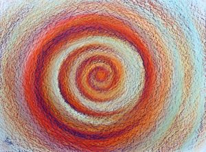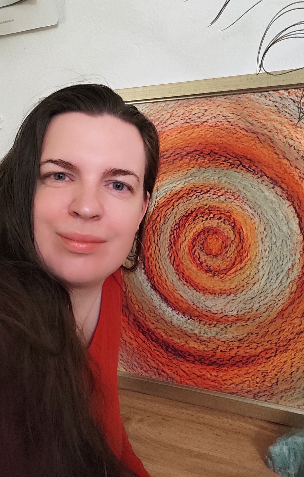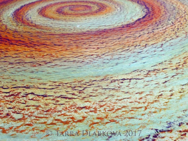 Ve struktuře samotné malby i barev vidím vlnky na jezeře, jeho břehy i hloubku, a nekonečný vtahující vír… Když se nadechnu, tak z malby doslova cítím vodu a mocný vír ohně.